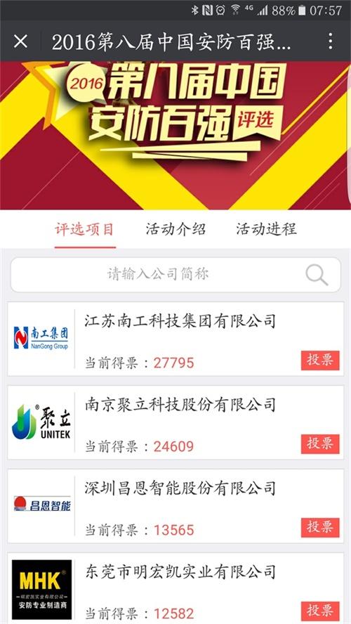 2016年10月10日,2016第八届中国安防百强网络评选从2016年9月24日开始至10月10日正式结束,集团荣获网络评选第一名,获得总票数为27795票。