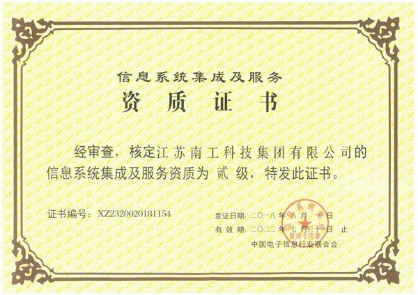2018年8月1日,江苏金年会科技集团有限公司获得信息系统集成及服务二级资质。