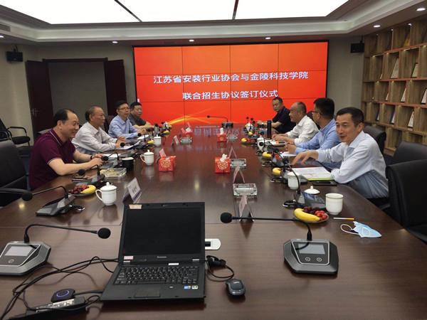 2020年5月11日,江苏省安装行业协会与金陵科技学院继续教育学院在江苏金年会科技集团有限公司进行校协联合招生协议签字仪式。参加仪式的有金陵科技学院继续教育学院院长邢红飞、副院长吴学松;金陵科技学院机电学院院长鞠全勇,楼宇系主任牟福元,办公室主任张玉,项目负责人姜玉东。江苏省安装行业协会驻会副会长邹金林、副会长陈晓、秘书长吴辉、副秘书长席天阳,江苏省安装行业协会智能化与消防工程分会副会长、江苏金年会科技集团有限公司执行董事陈俊桦,分会副秘书长余晶等。