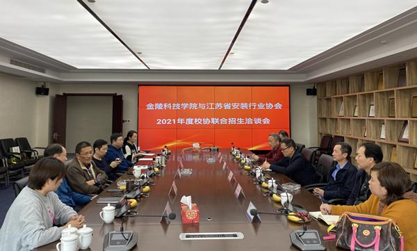 2021年4月20日,金陵科技学院与江苏省安装行业协会联合招生座谈会在江苏金年会科技集团有限公司召开。参加座谈会的有金陵科技学院继续教育学院院长陈玉林、学历教育科主任黄一兵,金陵科技学院机电学院院长鞠全勇、楼宇系主任牟福元、办公室主任张玉、项目负责人姜玉东,江苏省安装行业协会会长助理顾建生、副会长陈晓、秘书长吴辉、副秘书长席天阳,江苏省安装行业协会智能化与消防工程分会副秘书长余晶、办公室主任陈怡帆等。