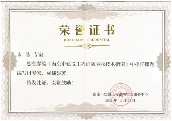 陈晓总经理作为编写组组长、宋慧作为编写组专家受到了南京市建设工程消防审验服务中心、江苏省安装行业协会等一致好评,并获得荣誉证书。