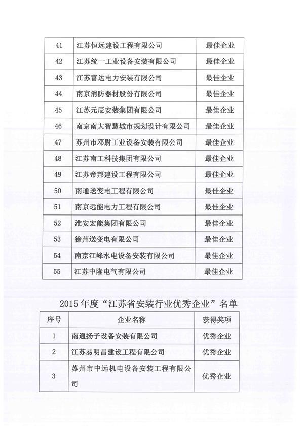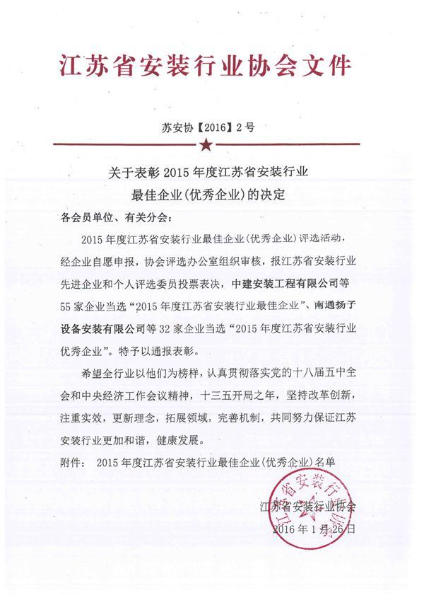 关于表彰2015年度江苏省安装行业最佳企业(优秀企业)的决定